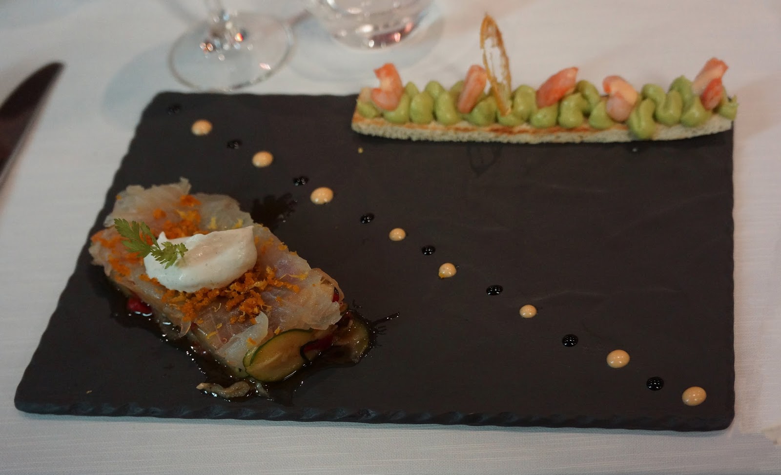 The amuse bouche was a scallop presented as a Japanese maki roll, a home-made cheese spread surrounding the scallop, all wrapped in seaweed (nori).
